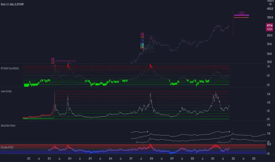 This is my attempt at remaking the cowen risk index. It's definitely not correct, but should give a rough estimate of where his indicator is at. I am taking the price divided by the 400sma to get an oscillator, then we need to account for diminishing returns so I just made an exponentially increasing variable and mutliplying that by the oscillator value. Then I normalized the data as best as I could. Not sure exactly how to do that so if anyone has any suggestions, please let me know.