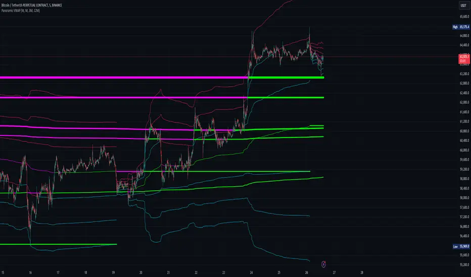 The Panoramic VWAP indicator provides a way to display up to four Volume Weighted Average Price (VWAP) lines on a chart, each anchored to different timeframes. This indicator also includes options for displaying standard deviation bands and close lines, offering a comprehensive view of price action across multiple time horizons.