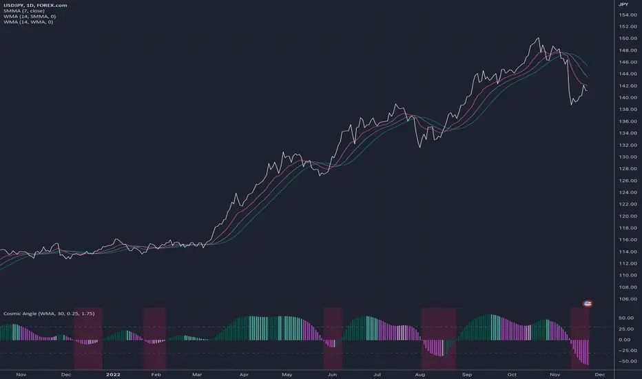 If your base moving average uses a short timeframe, the Cosmic Angle will likely look jagged and hard to read. An easy way to fix this problem is to add an extra moving average in between to smooth out the final output. In this example, a WMA with a short length of 9 is added onto the original SMMA and is then set as the source for the Cosmic Angle, producing a more relevant chart.