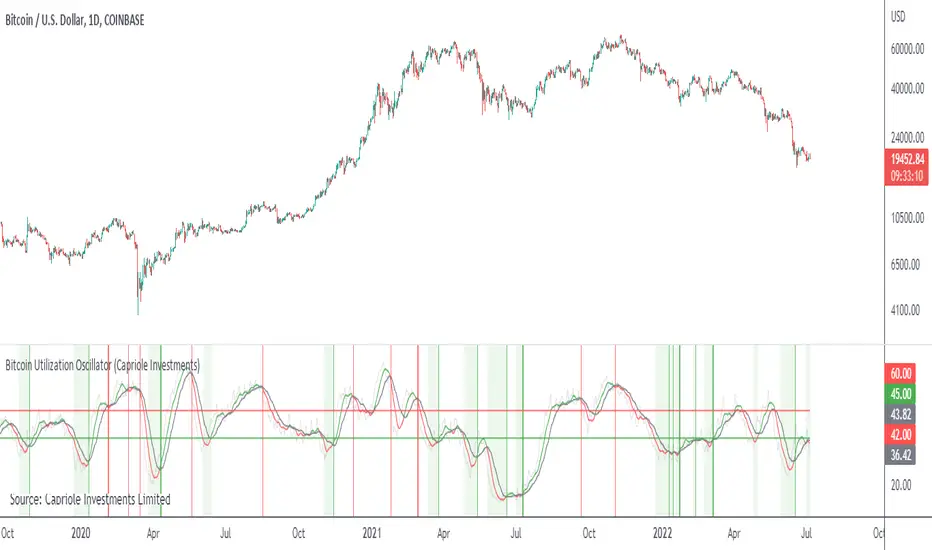 - Potential sell zones (red) - when the network utilization is high & decreasing