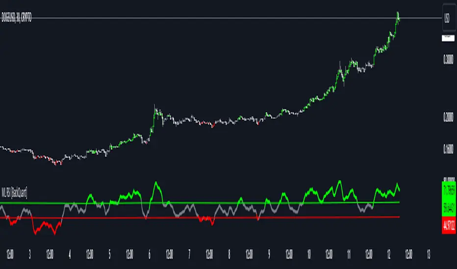 The Machine Learning RSI [BackQuant] represents a significant advancement in RSI-based trading indicators. By integrating Machine Learning clustering techniques, this script overcomes the limitations of static thresholds, providing dynamic, adaptive signals that respond to market conditions in real-time. With its robust visualization, customizable settings, and alert capabilities, this indicator is a powerful tool for traders seeking to enhance their momentum analysis and improve decision-making.