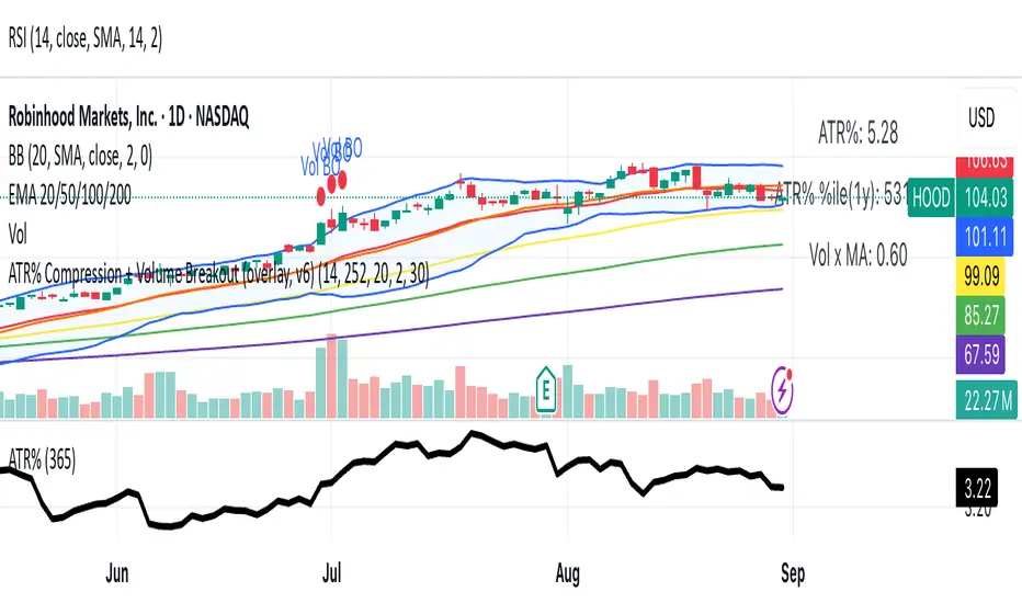 this is your signal/alerts tool. It tints compression regimes, marks volume-breakout bars, and fires the two alerts (“Compression Detected” and “Volume Breakout + ATR% Rising”).