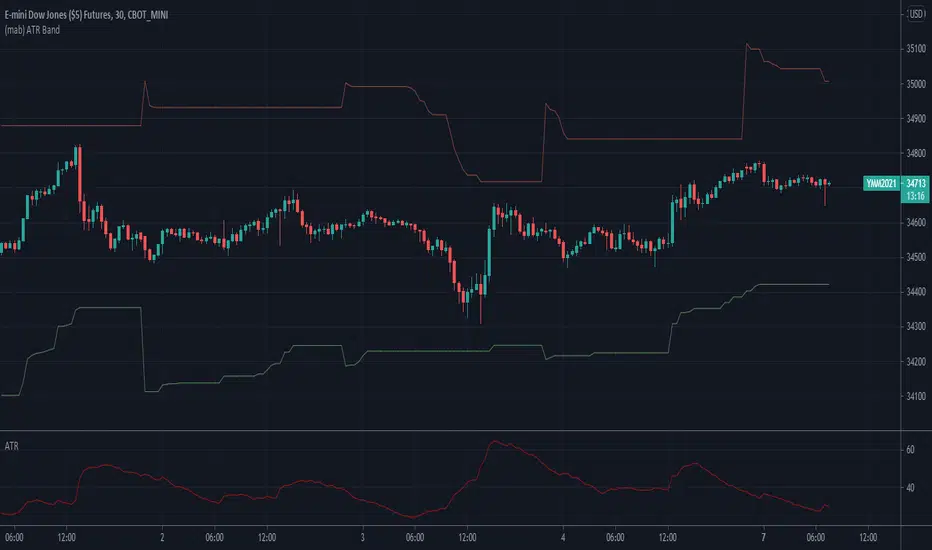This update enhances the (mab) ATR Band indicator with multi time frame capabilities. If "Floating daily ATR on intraday charts" is enabled, it shows the previous days ATR value as a starting point at the start of the session on intraday charts. At new lows it lowers the upper band to the new low plus the previous days ATR. At new highs it rises the lower band to the new high minus the previous days ATR.Similarly if "Floating weekly/monthly ATR on daily/weekly charts" is enabled, it shows the previous weeks ATR as starting point on daily charts and the previous months ATR on weekly charts. At new lows it lowers the upper band to the new low plus the previous weeks/moths ATR. At new highs it rises the lower band to the new high minus the previous weeks/months ATR.