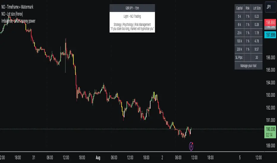 The "NCI - Lot Size (Forex)" is a comprehensive tool designed for Forex traders to optimise their risk management strategies. This indicator dynamically calculates and displays the ideal lot size for your trades based on real-time currency conversion rates and your predefined risk parameters.