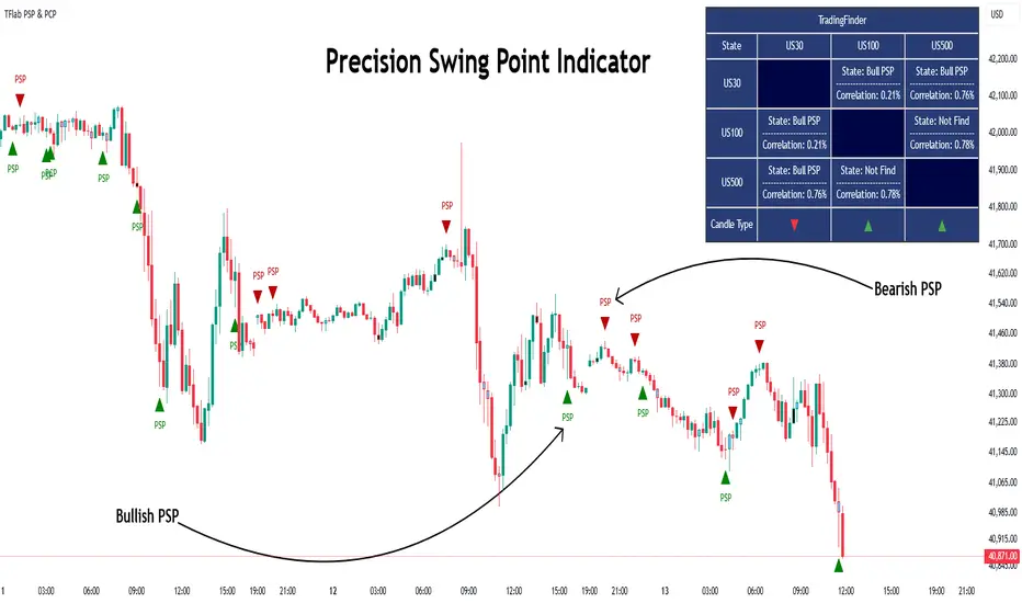 Precision Swing Point (PSP) is a divergence pattern in the closing of candles between two correlated assets, which can indicate a potential trend reversal. This structure appears at market turning points and highlights discrepancies between the price behavior of two related assets.