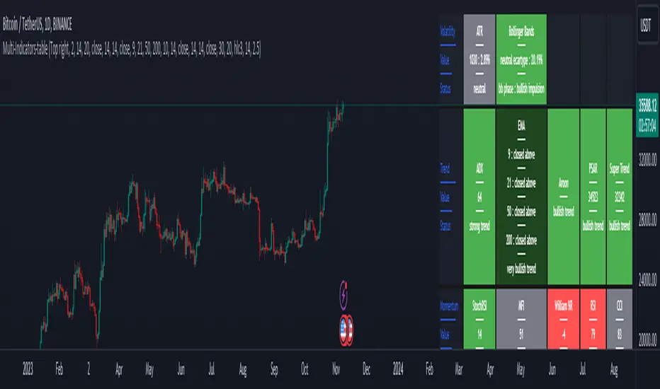 This is a comprehensive trading tool that presents an overview of the market in a tabular format. It consists of five distinct categories of trading indicators : Volatility, Trend, Momentum, Reversal, and Volume. Each category includes a series of indicators that are widely used in the trading communauty.