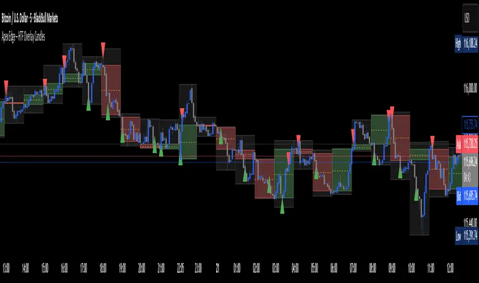 The Apex Edge – HTF Overlay Candles indicator overlays higher-timeframe (HTF) candles directly onto your lower-timeframe chart. Instead of flipping between timeframes, you see HTF structure “breathe” live on your execution chart.