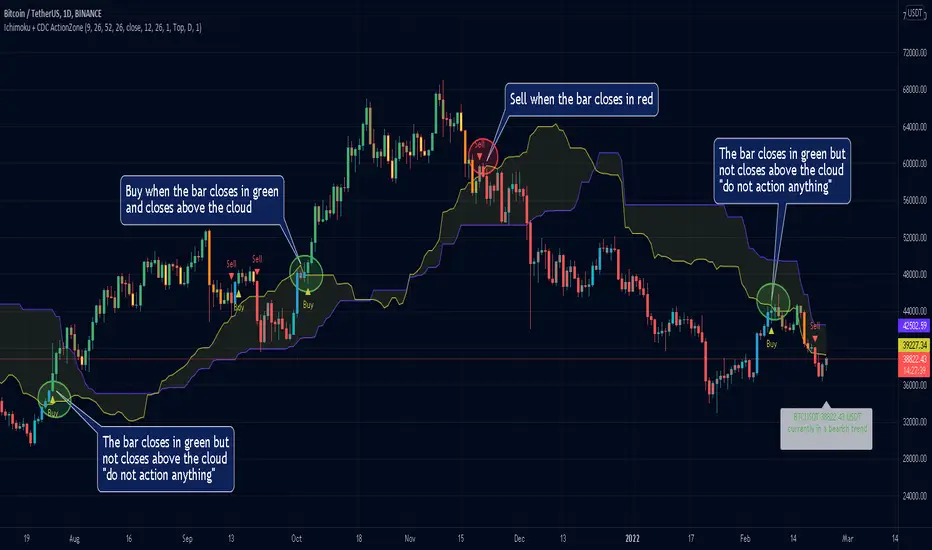 The basic method for using Ichimoku+CDC ActionZone is to follow the green/red color and the cloud.