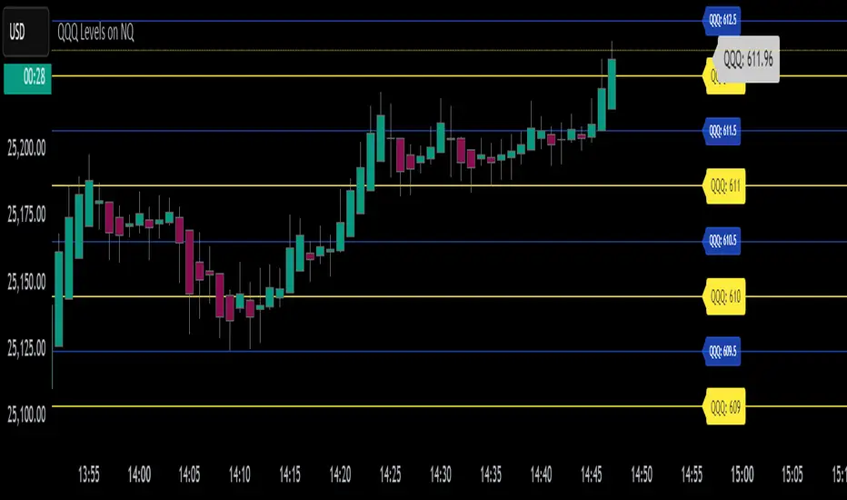 The indicator fetches real-time QQQ prices and calculates the 10 closest whole number levels (e.g., 480, 481, 482) plus half levels (480.5, 481.5, 482.5) around the current price. When applied to NQ or MNQ charts, it automatically scales these levels to match futures pricing, giving you precise QQQ-correlated support and resistance zones.