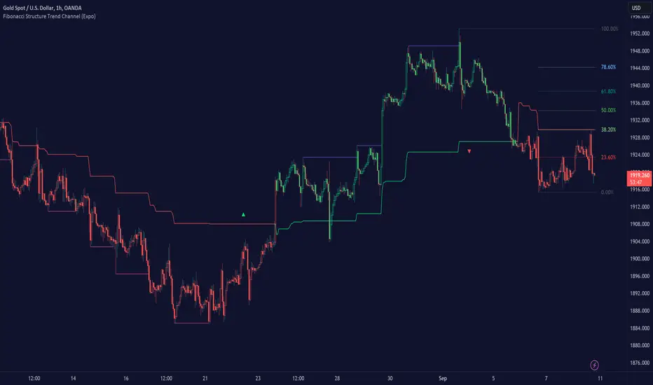 The Fibonacci Structure & Trend Channel (Expo) is designed to identify trend direction and potential reversal levels and offer insights into price structure based on Fibonacci ratios. The algorithm plots a Fibonacci channel, making it easier for traders to identify potential retracement points. Additionally, the Fibonacci market structure is plotted to enhance traders' understanding of the underlying order flow.