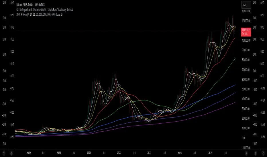 This indicator displays a multi-period Simple Moving Average (SMA) ribbon to help visualize short-term and long-term trend structure. The ribbon is composed of eight SMAs with customizable periods, allowing traders to see how price interacts with both fast and slow moving averages.When shorter-period SMAs are stacked above longer-period SMAs, the market is generally trending upward. When shorter-period SMAs are below longer-period SMAs, the market is generally trending downward. The spacing and compression of the ribbon can also indicate trend strength or potential reversals.