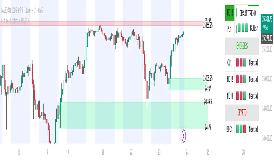 Multi-timeframe Futures Heatmap that visualizes trend and strength across Indexes, Metals, Energies, and Crypto — all in one clean dashboard.