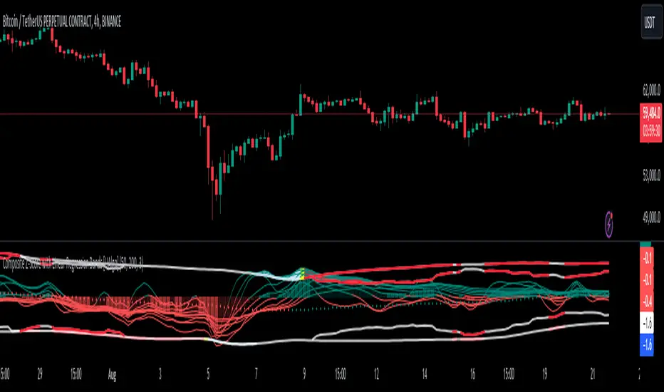 The Composite Z-Score with Linear Regression Bands indicator employs a multi-timeframe analysis by calculating Z-scores for various moving average lengths. This approach provides a more comprehensive view of market dynamics and helps to identify trends and potential reversals across different timeframes. By considering multiple lengths, we can: