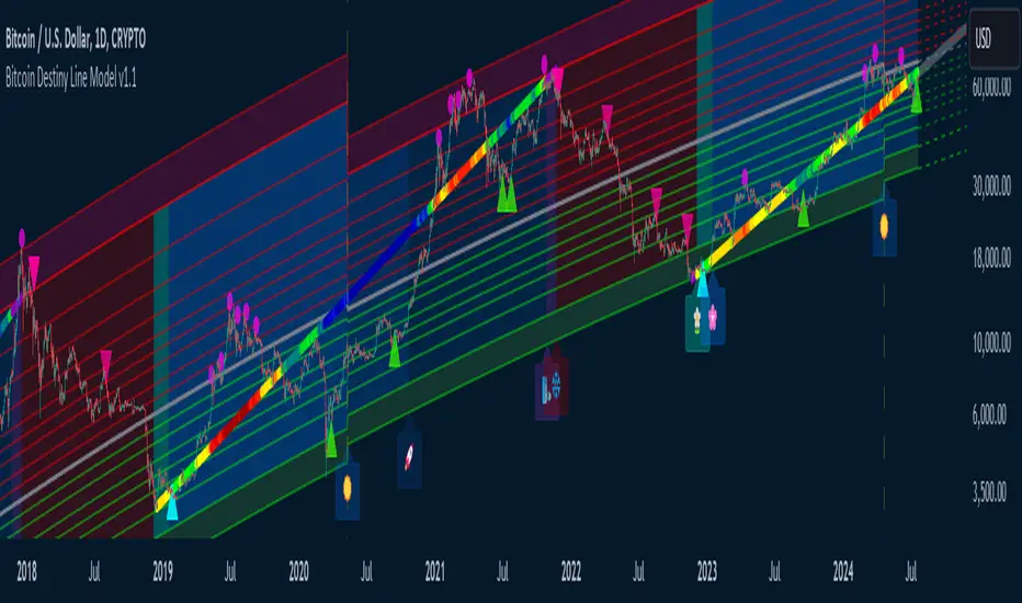 The Bitcoin Destiny Line Model is a technical analysis toolset designed exclusively for Bitcoin. It integrates a comprehensive suite of analytical methodologies to provide deep insights into Bitcoin's market dynamics focusing on long-term investment strategies.