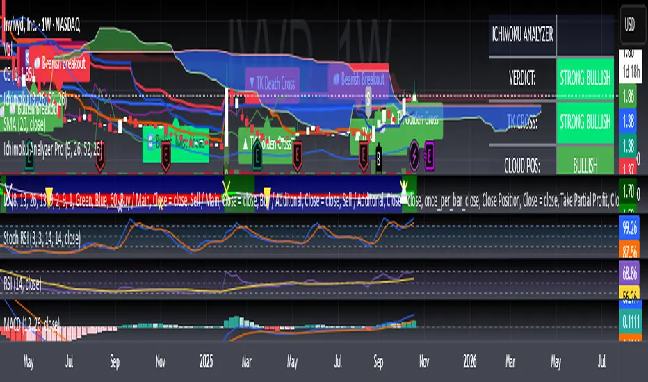A comprehensive trading indicator combining traditional Ichimoku Cloud analysis with MACD momentum confirmation and intelligent signal scoring. Designed for TradingView Pine Script v6, this tool provides automated verdict generation and real-time visual signals.