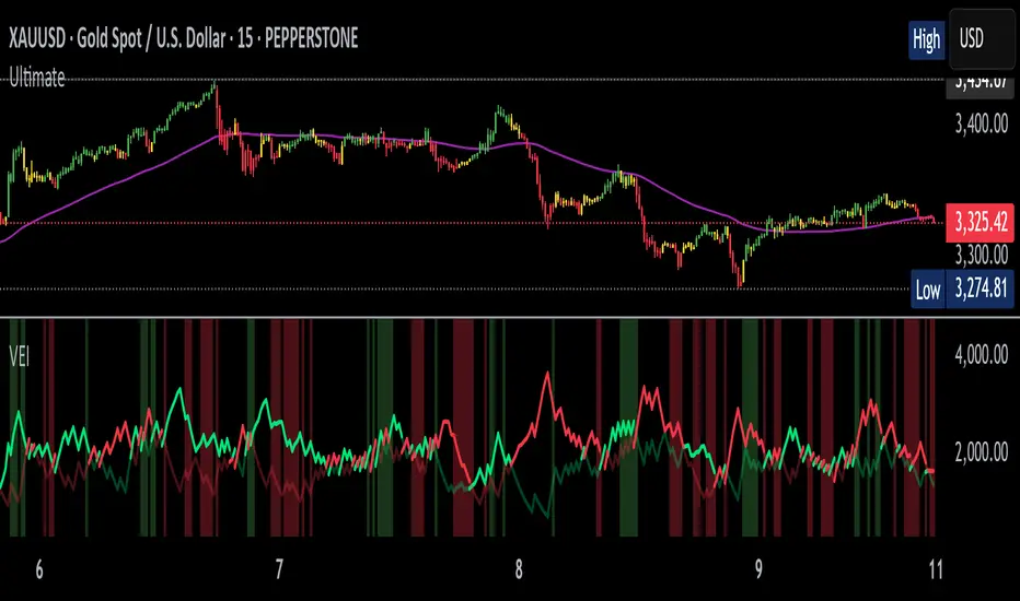 • It compares directional EMAs of raw volume to isolate real-time bias and acceleration.