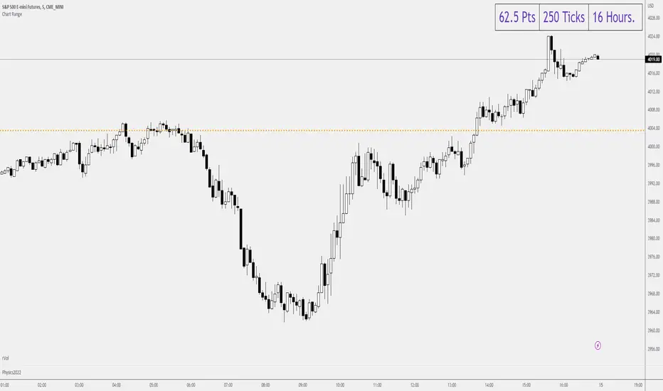 This will show you how much price opportunity was available in the amount of time you are currently viewing. Using the PineCoders VisibleChart library, we're retrieving the time and bar_index of the beginning of the chart so that everything that is currently on the chart is measured and it adapts as that changes.