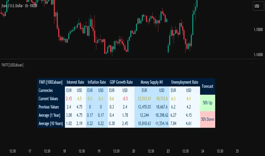 This indicator is a macro-level fundamental analysis tool for major Forex currency pairs (USD, EUR, GBP, JPY, CHF, AUD, NZD, CAD). It displays five key economic indicators of both currencies in a table format, presented as an oscillator. The indicator is provided as closed-source and is designed solely for research and analysis purposes (no backtesting, no direct buy/sell signals). It is closed-source to protect our proprietary weighting algorithm for each indicator and to support planned expansion into larger projects; open-sourcing would compromise our business model.