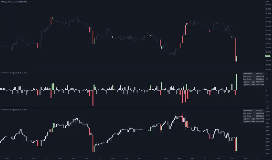 This script is an all-in-one indicator that uses aggregated Open Interest data to plot OI candles, Open Interest Delta, OI x rVOL, and OI RSI. It also includes tools such as an OI Distribution profile, large OI increase/decrease coloring, a Stats Screener, and much more.