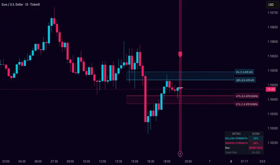 It then projects those probabilities forward as clean levels and a bias dashboard on your chart.