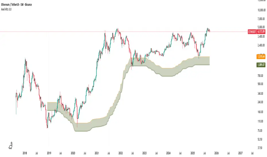 Axel Alts is a custom indicator designed to visualize dynamic support zones for cryptocurrencies, including both Bitcoin and altcoins.