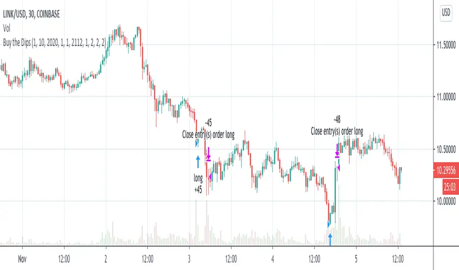 Crypto markets offer high volatility and, thus, excellent opportunities for trading. Excluding times of severe downtrend, buying the dip is a simple and effective long-term trading strategy. The buy-signal is set to a 2% drop in a 30-minutes time frame.