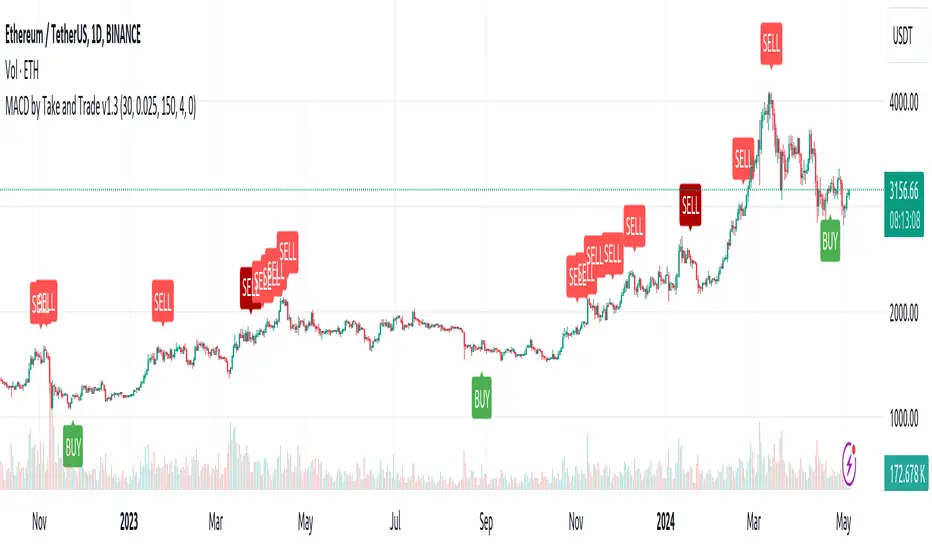 - Highlighted BUY/SELL signals with divergence (if a signal is accompanied by divergence, for example, price makes a new high while macd has a second high below the first, this signal is considered stronger and will be highlighted in a darker color)