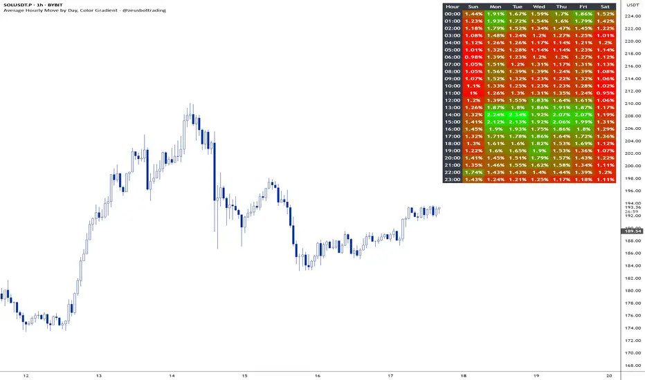 This Pine Script called "Average hourly move by zeusbottrading" calculates and displays the average percentage price movement for each hour of the day using the full available historical data.