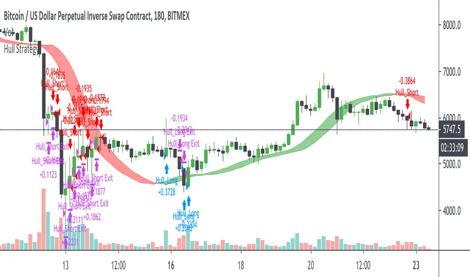 It uses two lagged hull moving averages at the intersection of which a change in trend is determined.