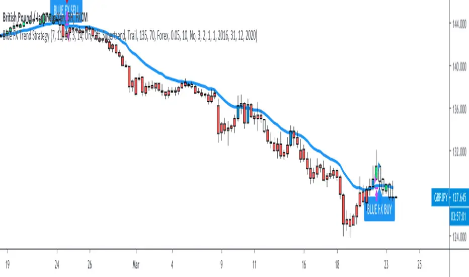 When all criteria is in alignment the strategy will convert all candles to the relevant colour - Green for an uptrend and Red for a downtrend; a candle that is printed normally simply shows that no current trend is in place to warrant a colour change. A normal coloured candle could possibly indicate a change in current market direction or the market consolidating before a further move in the initial direction. When a new signal is valid 'Blue FX Buy'' or 'Blue FX Sell' will be displayed and the small arrow shown on candle open for entry.