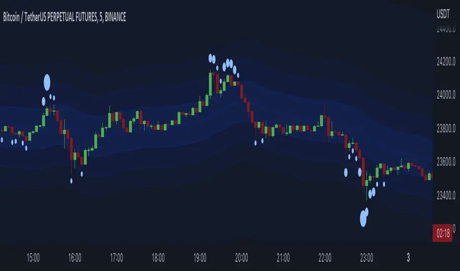 Along with CVD bubbles, this script plots continuous bands that represent 100x, 75x, 50x, 25x liquidation levels. The bands can serve as support/resistance, reversal points, expected volatility range and more.