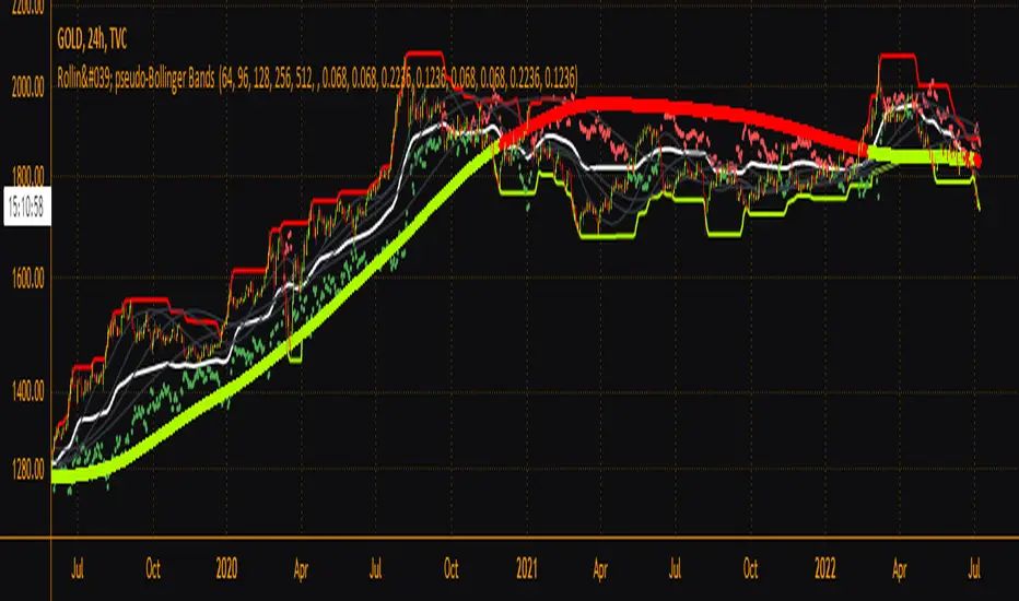 5 linear regression curves and new highs/lows mixed together from the basis for this indicator. Using slightly different logic an upper boundary and lower boundary are formed. Then the boundary's are built upon to show price channels within the band using variations of fib levels and the distance between the initial boundary's. Dots plotted show the inverse of the close price relative to either the upper or lower boundary depending on where the close is relative to the center of the band. This shows the market's tendency for symmetry which is useful when looking for reversals etc. If it's too cluttered feel free to turn off some things in the options and keep what you feel is helpful.
