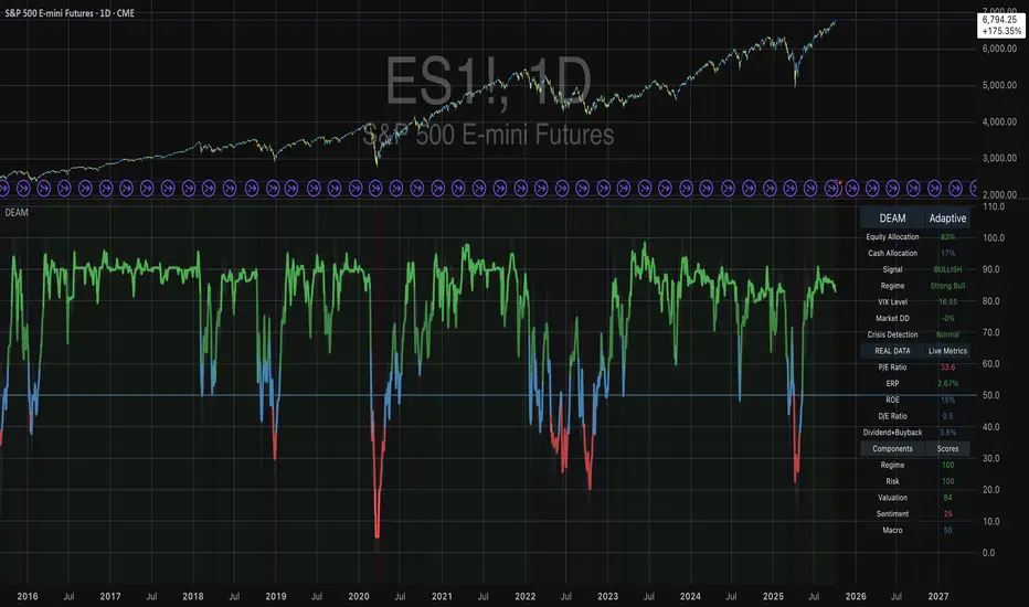 DEAM's components are based on established financial theory and empirical evidence. The market regime component follows from regime-switching models (Hamilton, 1989) and trend-following literature. The risk management component implements volatility targeting (Moreira and Muir, 2017) and modern portfolio theory (Markowitz, 1952). The valuation component is based on discounted cash flow theory and empirical value research (Campbell and Shiller, 1988; Fama and French, 1992). The sentiment component integrates behavioral finance (Baker and Wurgler, 2006). The macro component uses established business cycle indicators (Estrella and Mishkin, 1998).