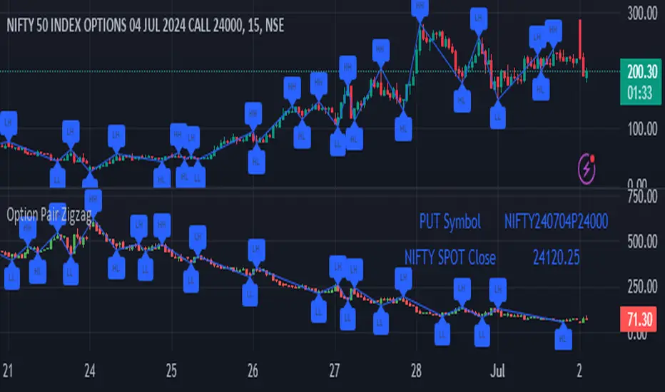 The indicator will find other option pair symbol and load it’s chart in indicator window. It will also draw a zigzag on both the charts. It will also fetch the SPOT symbol and display SPOT Close price of latest candle.