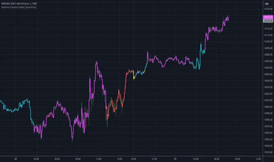 The Relative Volume Candles indicator is based on the Zanger Volume Ratio and designed to help identify key volume patterns effortlessly, with color coded candles and wicks.