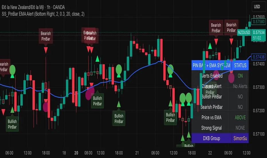 Indicator detects Pin bar candlestick patterns and adds EMA line function to create various types of alerts. Supports traders in not having to spend time monitoring Pin bar patterns and the crossover of the chart and the EMA line.
