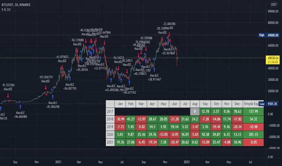Very excited to bring this script to the public. This is a very useful table that displays the performance of any strategy you give it in a more detailed view. It runs on all timeframes and at any position on the chart with the replay function. It also updates on tick changes. The table consists of three modes: Simple Equity, Compound Equity and Drawdown.