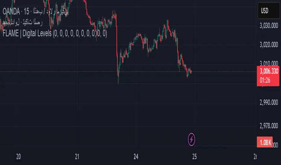 The FLAME Indicator aims to help you identify dynamic support and resistance levels on the chart. The indicator is based on horizontal lines set by the user, and their color changes depending on whether the price is at or above these lines (support) or below them (resistance). Here's a detailed explanation of each part of the indicator:
