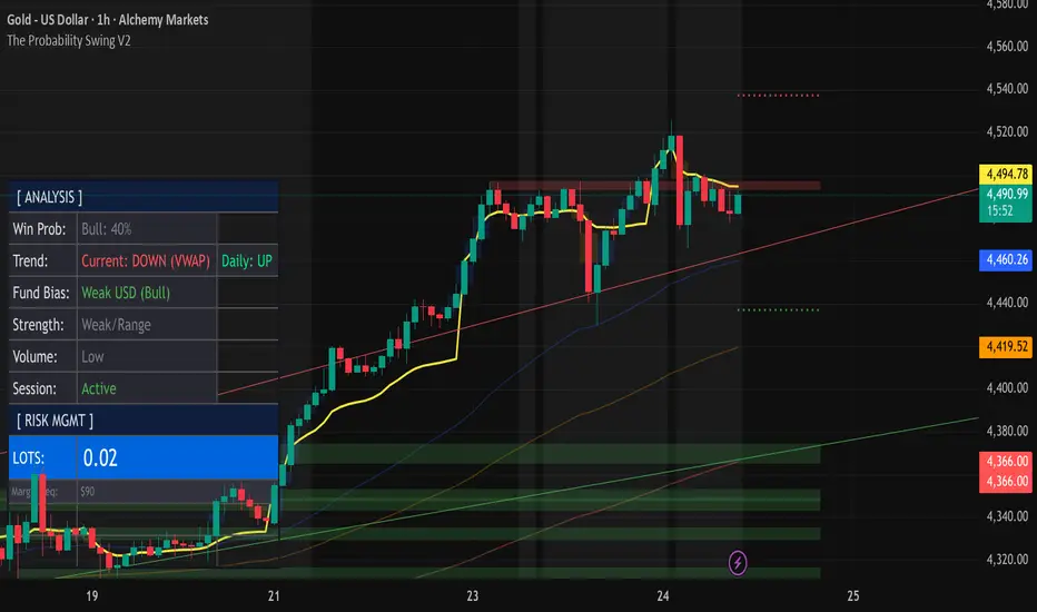 The Probability Swing is not just a signal indicator; it is a complete trading ecosystem. It combines Macro-Economic Fundamentals, Institutional Volume Analysis, and Market Structure to calculate a real-time "Win Probability" for every trade setup.