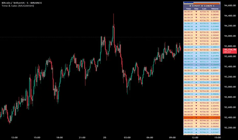 The “Time and Sales” (Tape) indicator generates trade data, including time, direction, price, and volume for each executed trade on an exchange. This information is typically delivered in real-time on a tick-by-tick basis or lower timeframe, providing insights into the traded size for a specific security.