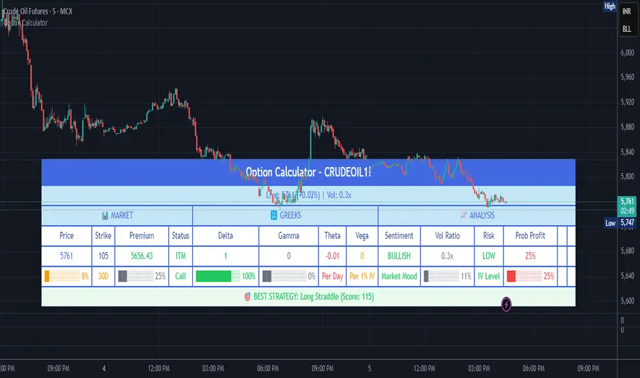 The aiTrendview Option Calculator is a feature-rich options trading dashboard built using Pine Script, designed for real-time market interpretation and strategy selection. It integrates Black-Scholes-based pricing models with dynamic market inputs to help traders evaluate directional bias, volatility, risk, and potential profitability in a structured, intuitive format. The tool supports both beginner and experienced options traders in making data-driven decisions.