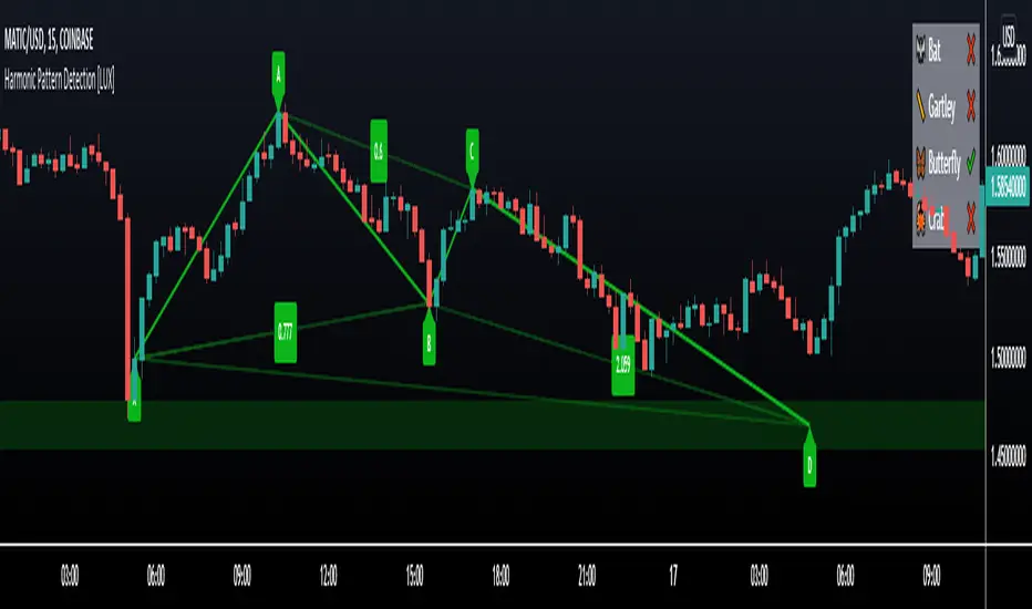 Bullish butterfly pattern on MATICUSD15. It is important not to use an XA precision value that would return overlapping ranges between the Gartley/Harmonic and other patterns. Using the default value is recommended.