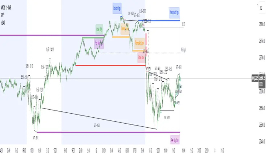 - Session Highs/Lows: Tracks and draws lines for Asian and London sessions, previous day/week, and pre-market highs/lows. Lines extend until mitigated by price, with optional labels.
