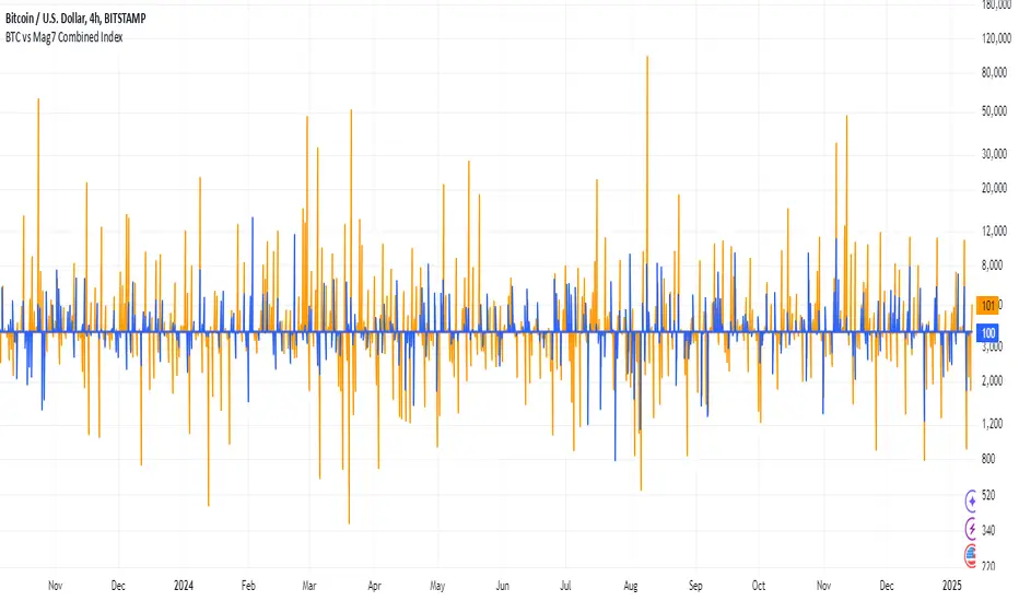 This indicator is ideal for analyzing the overall market impact of Bitcoin compared to the Mag7 stocks. This script is a custom TradingView indicator that calculates and visualizes the collective performance of the Magnificent 7 (Mag7) stocks—Apple, Microsoft, Alphabet, Amazon, NVIDIA, Tesla, and Meta (blue line) compared to Bitcoin (orange line). It normalizes the daily closing prices of each stock to their initial value on the chart, scales them into percentages, and then computes their simple average to form a combined index. The result is plotted as a single blue line, offering a clear view of the aggregated performance of these influential stocks over time compared to Bitcoin.Script de código aberto