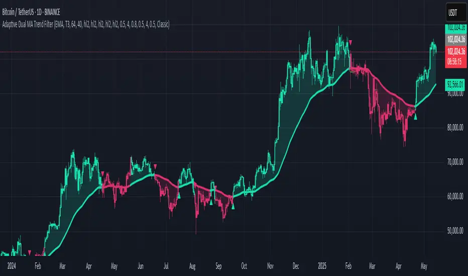 Adaptive Dual MA Trend Filter is a versatile Pine Script™ indicator that delivers clear, reliable trend signals using customizable moving averages: