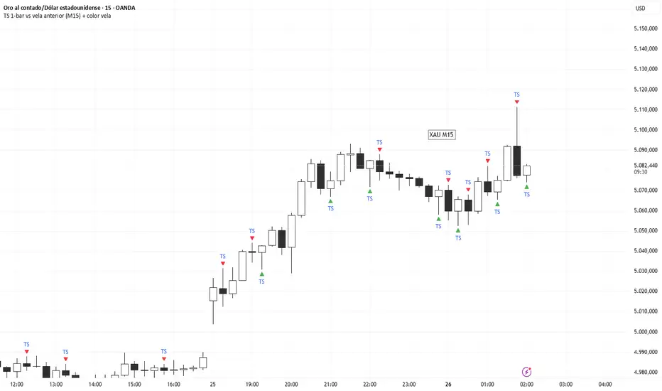 This script detects a “TS” (sweep + close back inside) against the immediately previous candle (1-bar), and it triggers only after the candle closes.