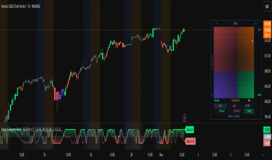 I built this indicator because I was frustrated with oscillators that just showed values without context. I wanted to know what regime the market was in. I wanted to know whether smart money was confirming the move. I wanted to know whether momentum was building or fading.