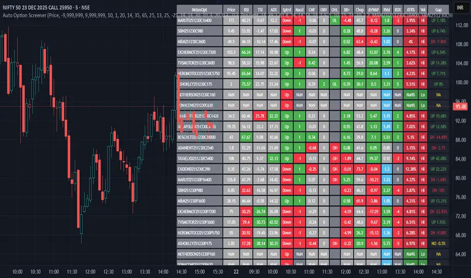 **Auto Option Screener Pro** is a comprehensive **multi-symbol technical analysis dashboard** designed specifically for **NSE options traders**. It simultaneously monitors **30 symbols** (calls/puts) and displays real-time data for **15+ professional indicators** in a sortable, filterable table format.