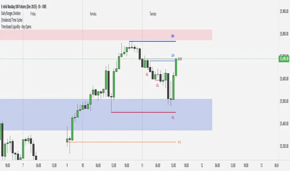 Time Based Liquidity - Key Opens - Plots Monthly H/L - Weekly H/L - Daily H/L - Asia H/L - London H/LPlots Key Opens - Monthly - Weekly - Daily - Cycle Open - Midnight Open