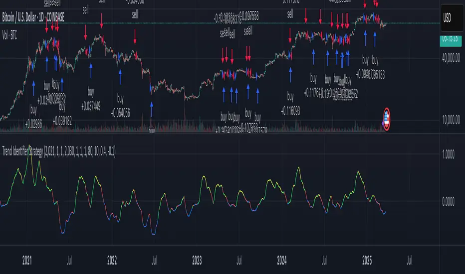 The indicator smoothens a closely following moving average into a polynomial like plot and assumes 4 staged cycles based on the first and the second derivatives. This is an optimized strategy for long term buying and selling with a Sortino Ratio above 3. It is designed to be a more profitable alternative to HODLing. It can be combined with 'Accumulation/Distribution Bands & Signals' and 'Exponential Top and Bottom Finder'.